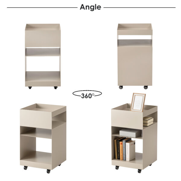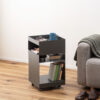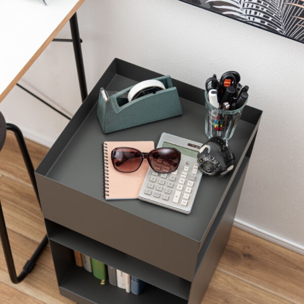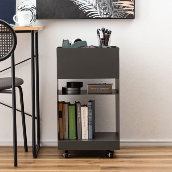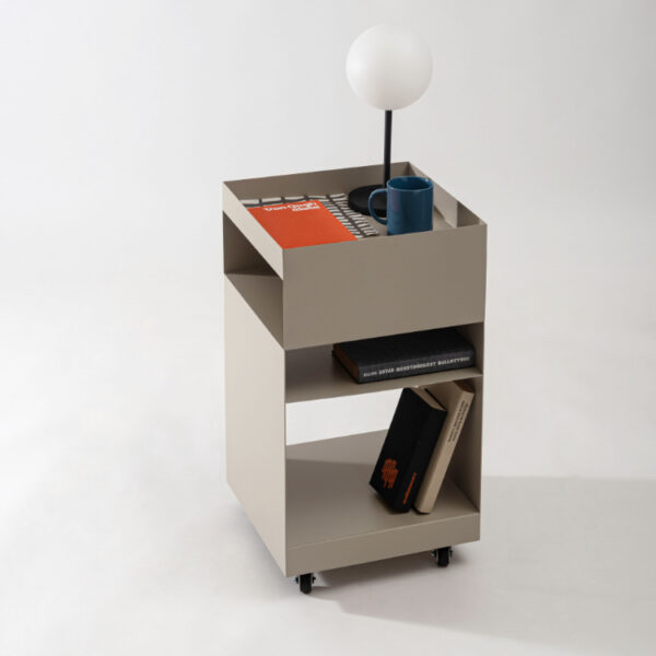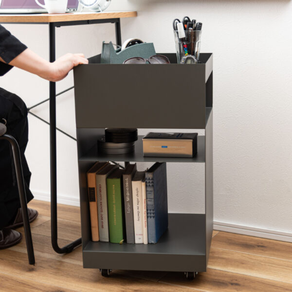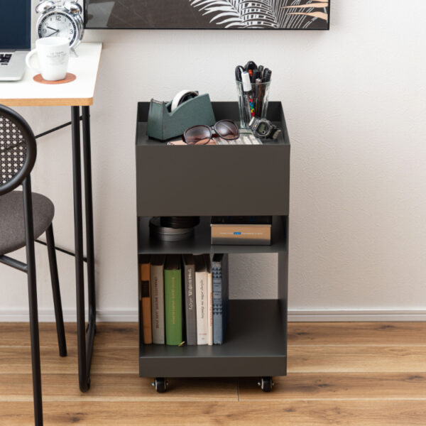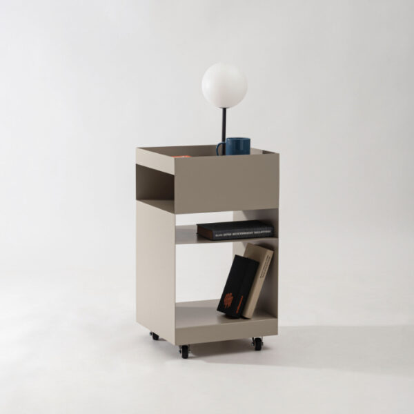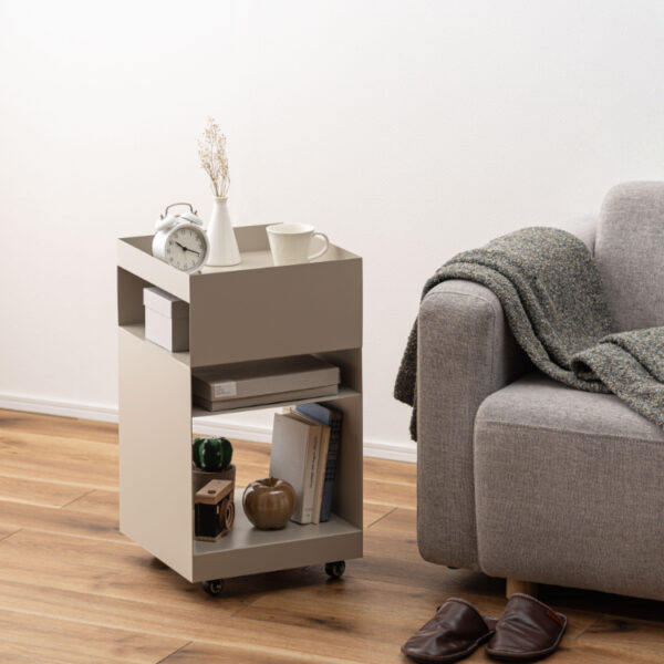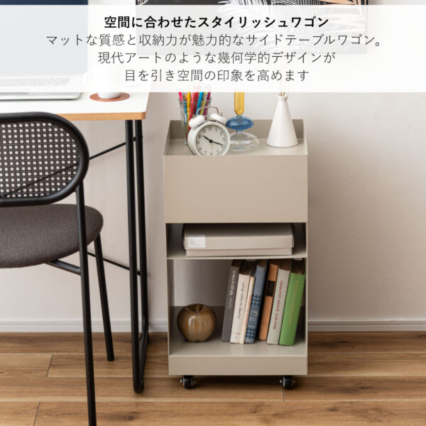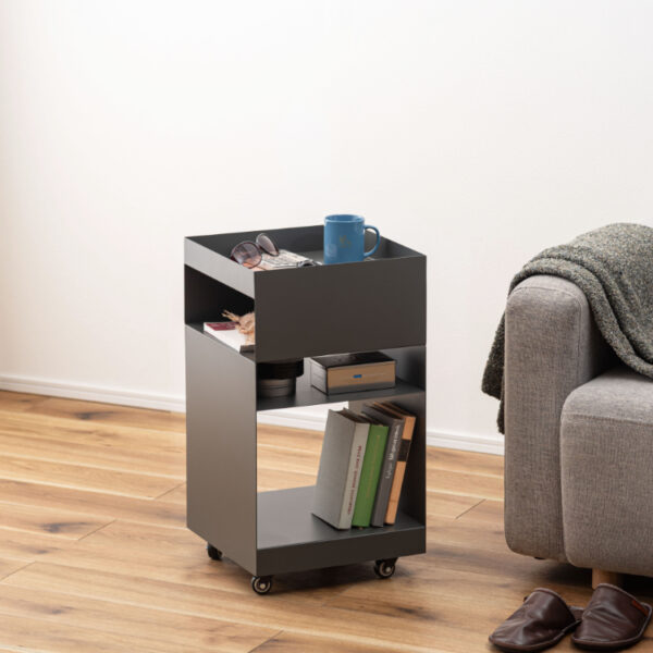 マットな質感と収納力が魅力的なサイドテーブルワゴン。現代アートのような幾何学的デザインが目を引き空間の印象を高めます。
