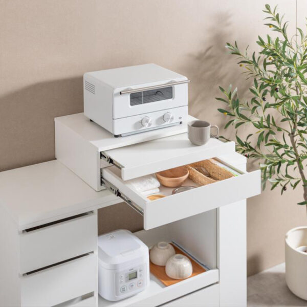| 幅50cmタイプと幅80cmタイプの2つのサイズをご用意したため、置きたい場所や用途に合わせお好きな幅をお選びいただけます。また、レンジや炊飯器などキッチン家電の下に省スペースで設置できるため、今の環境を大きく変えないまま、作業効率を大幅アップすることが可能です。 |