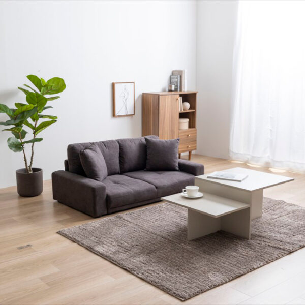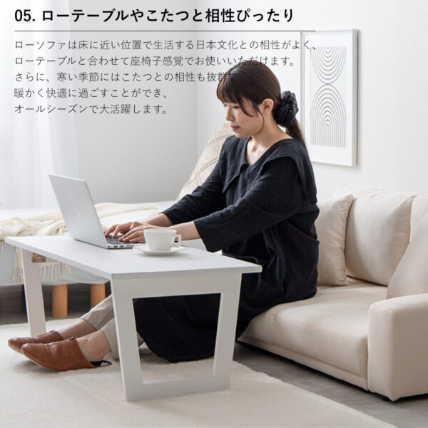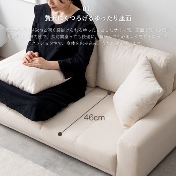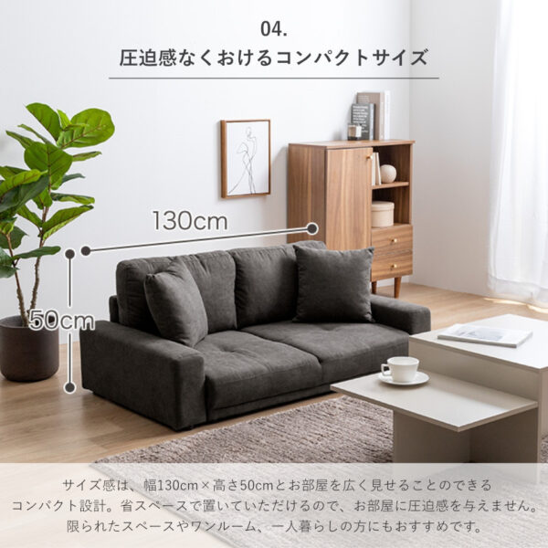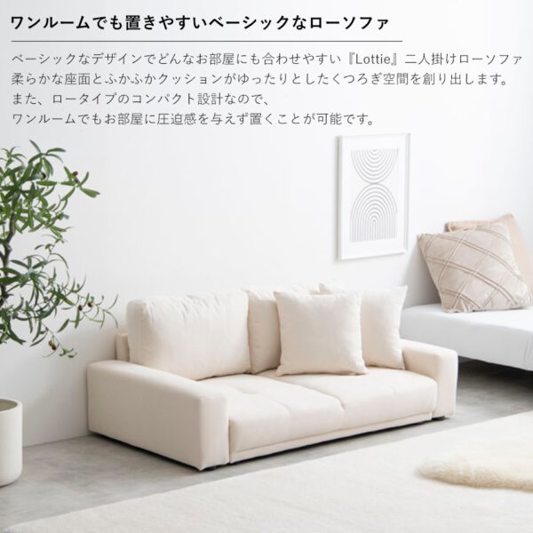 | ワンルームでも置きやすいコンパクトなロー設計なので、お部屋に圧迫感を与えず置くことができます。座面クッションと背面クッションはふかふかで、ゆったりとしたくつろぎの空間を作り出します。 |