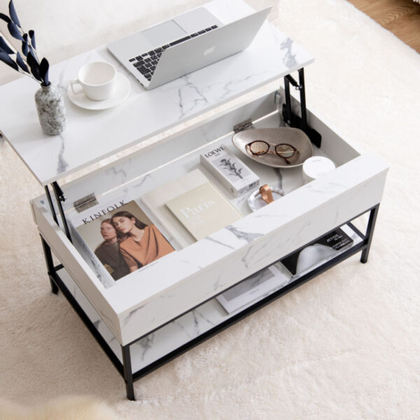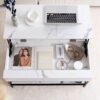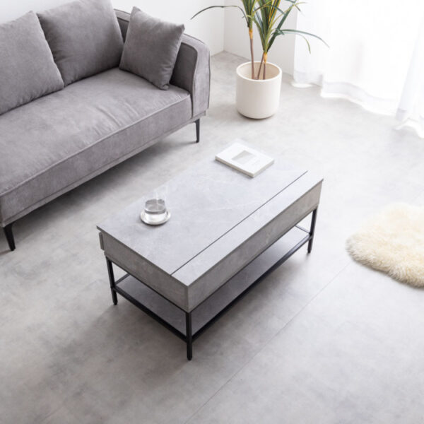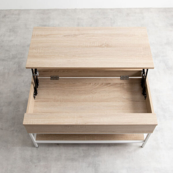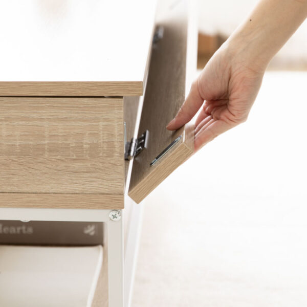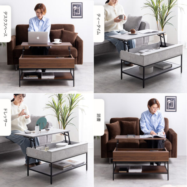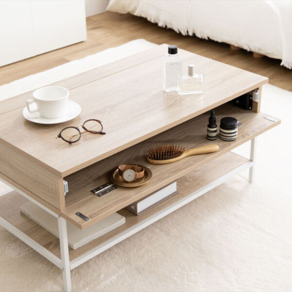 | 天板は昇降式で、様々なシーンに合わせて使用することができます。また、天板下には収納スペースがあり、リビング周りの小物をすっきり収納することが可能です。 |