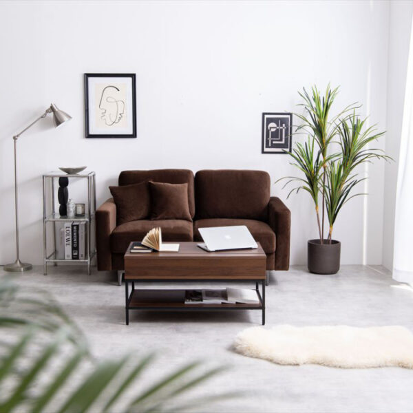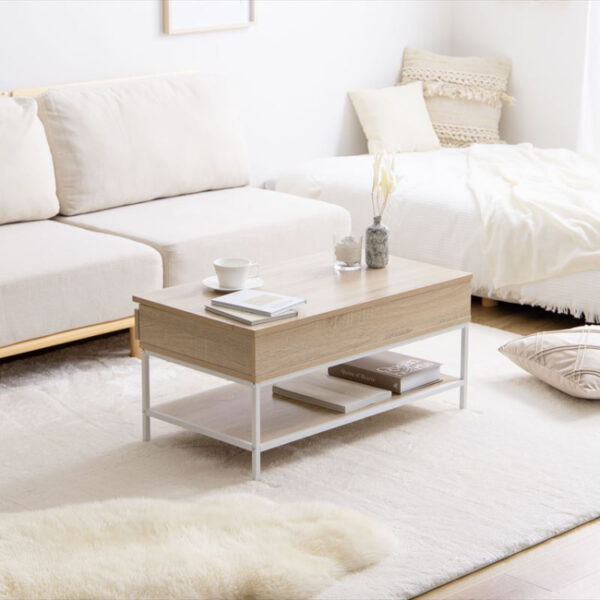 天板は昇降式で、様々なシーンに合わせて使用することができます。また、天板下には収納スペースがあり、リビング周りの小物をすっきり収納することが可能です。